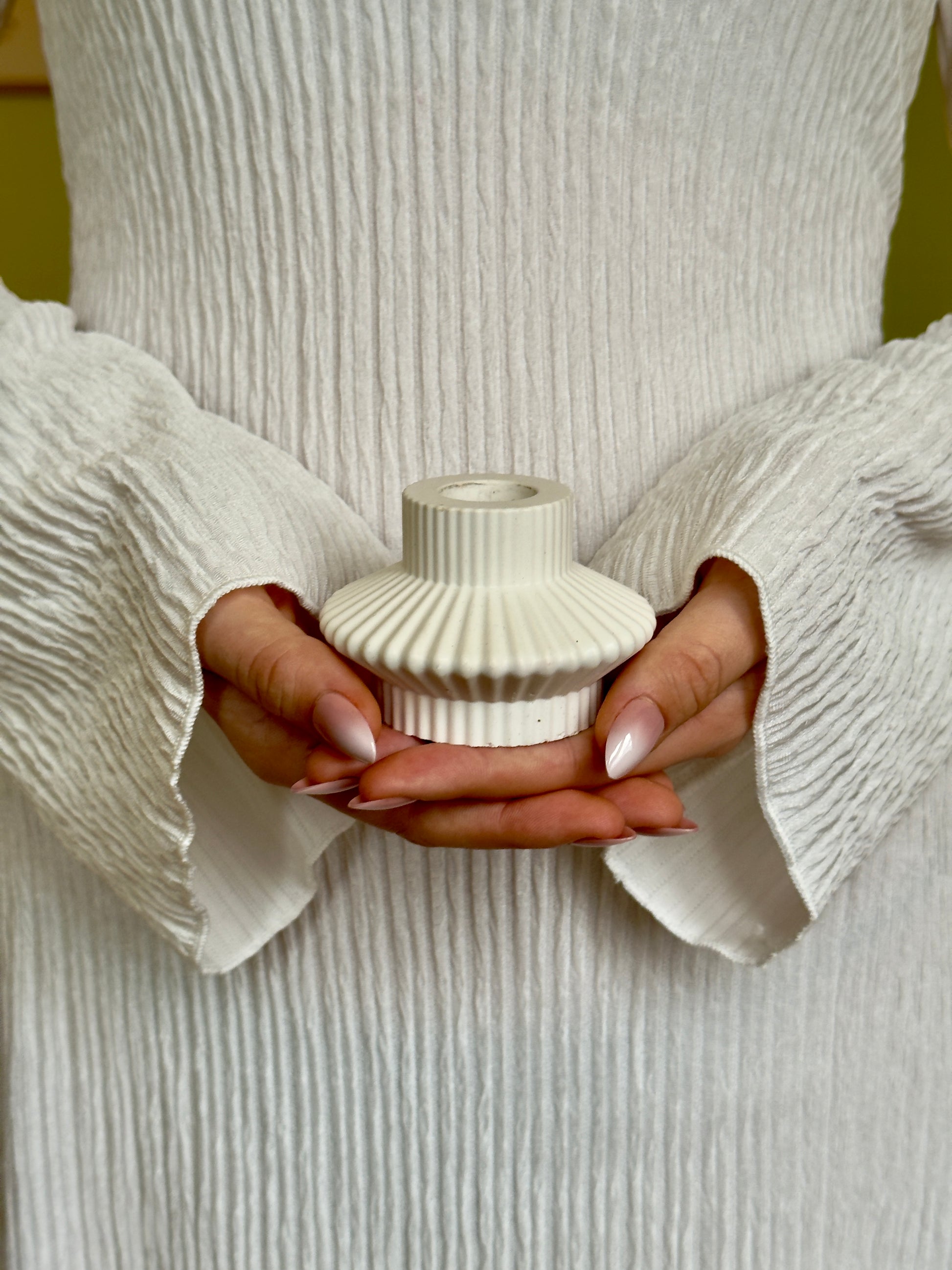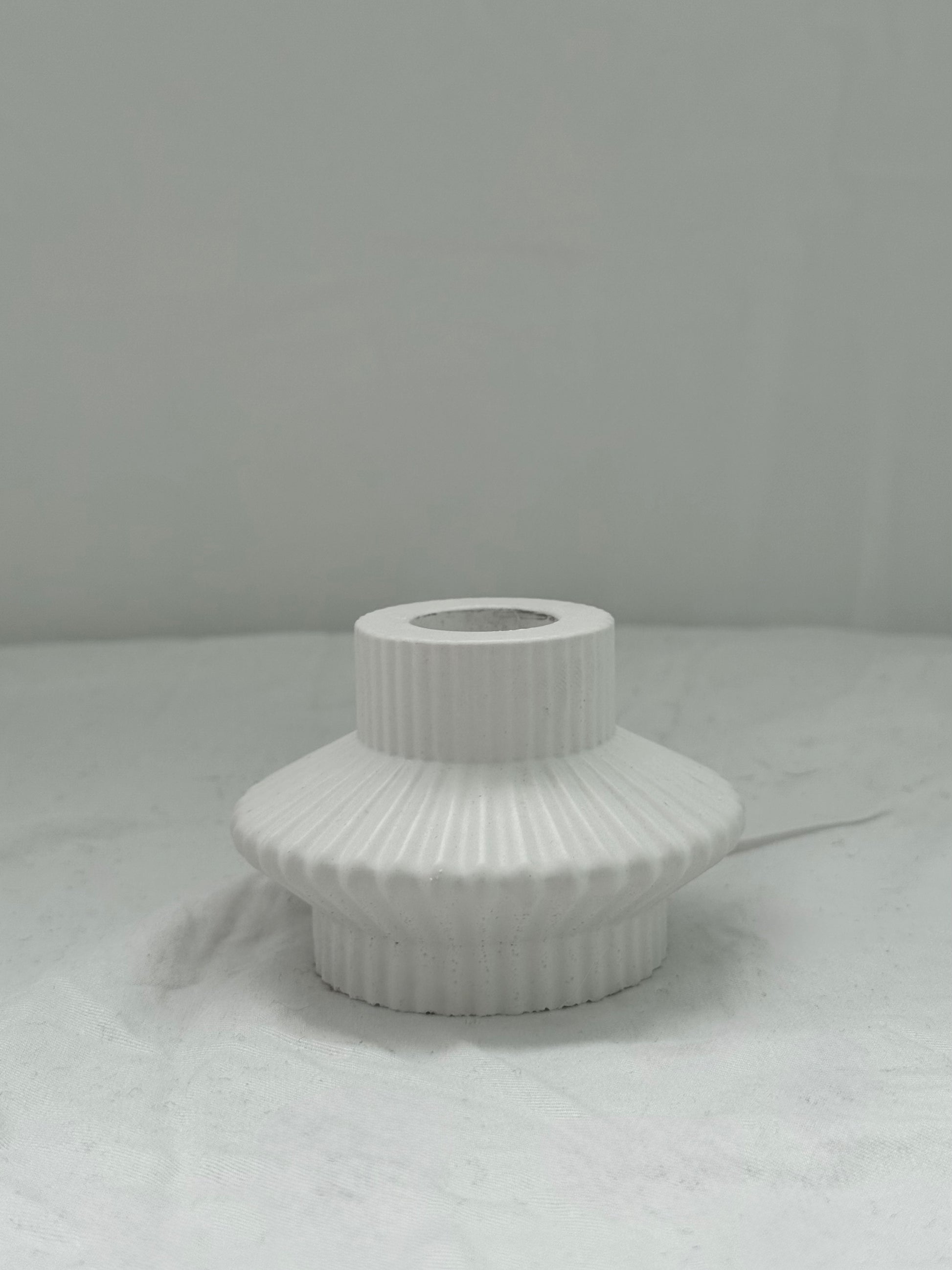 Elegant, rå och tidlös. Gråton ljusstake är mer än bara ett ljushållare, det är en skulptural detalj som ger karaktär åt rummet. Den räfflade ytan och den geometriska formen skapar ett harmoniskt möte mellan det industriella och det estetiska.