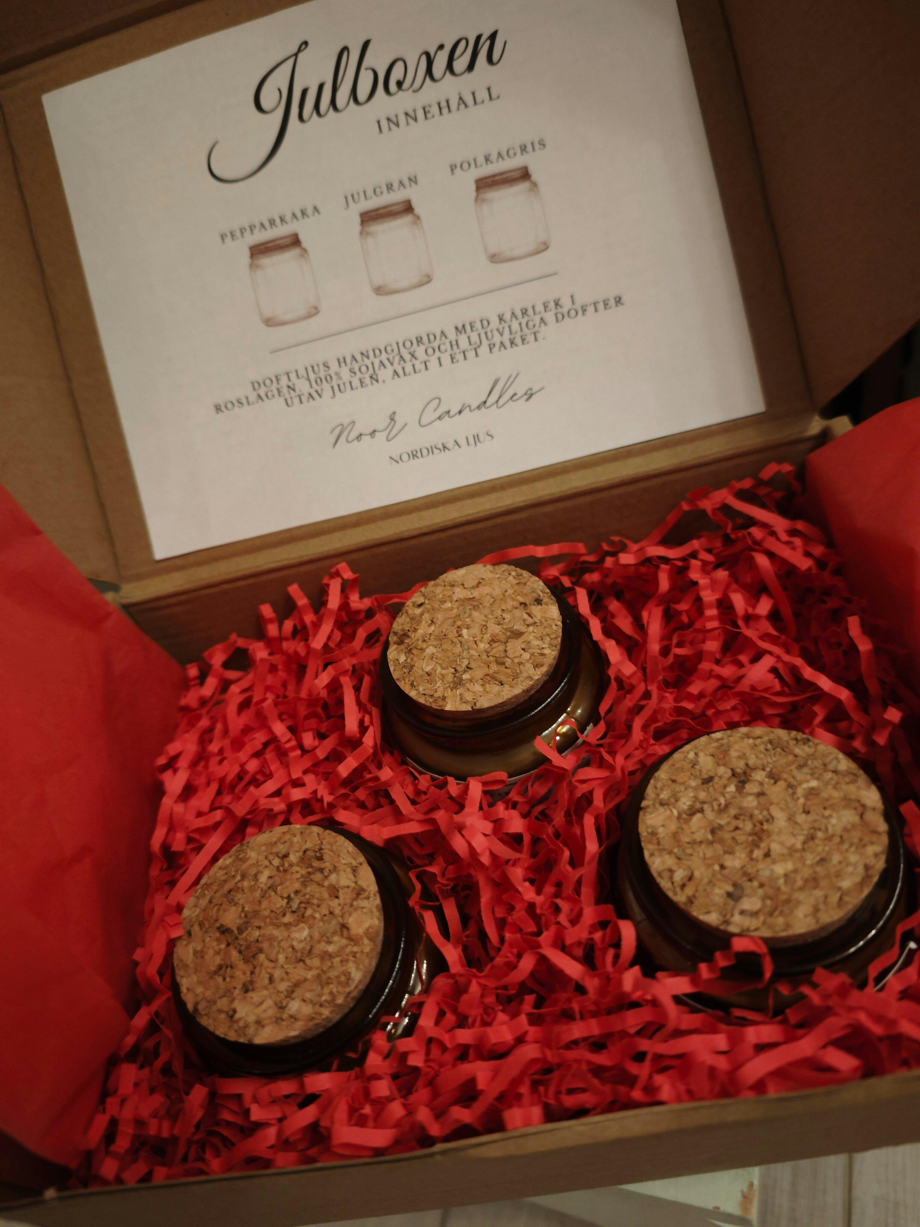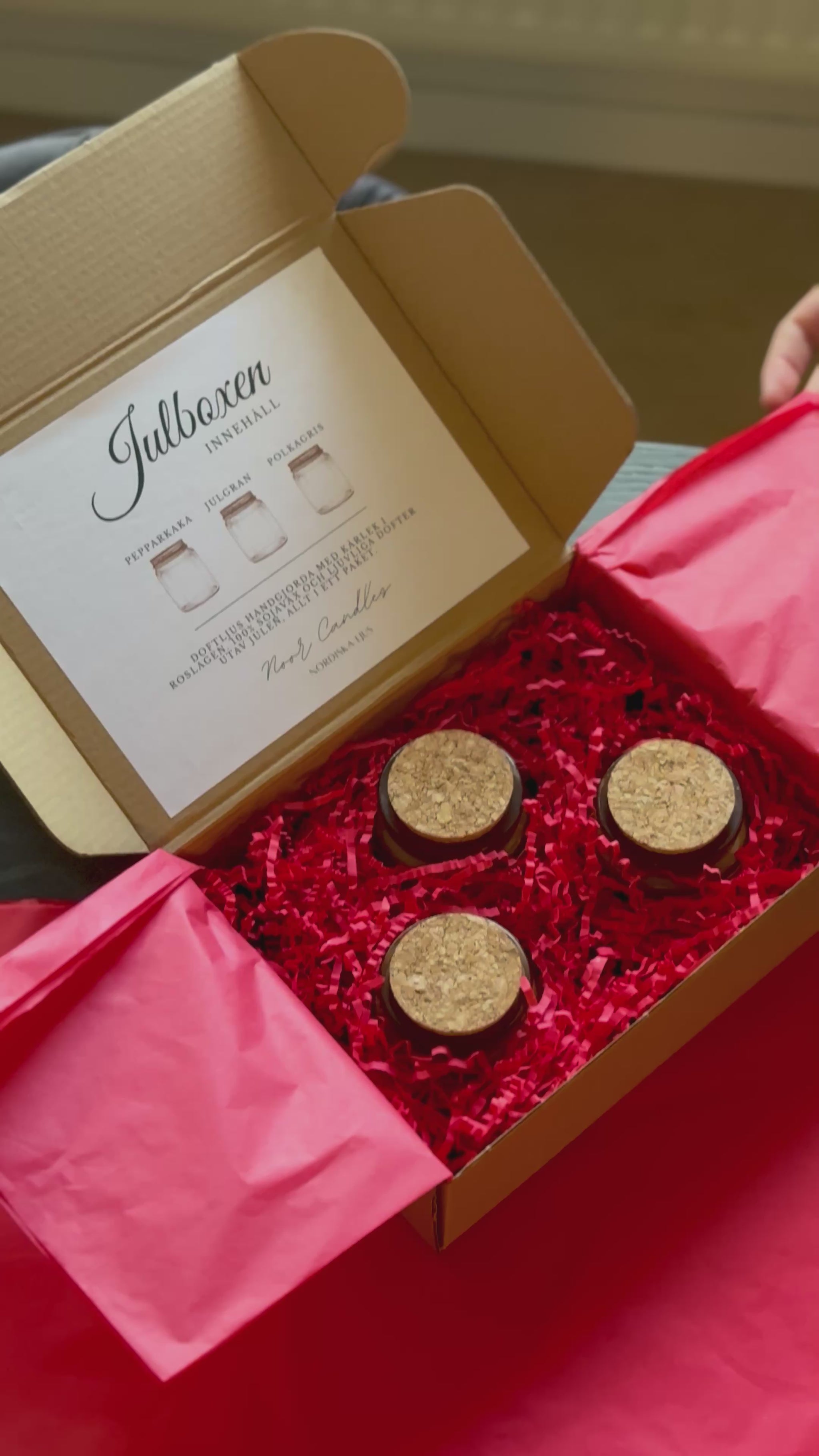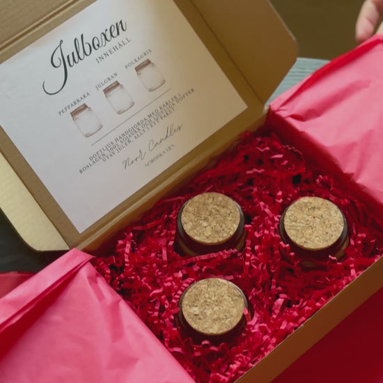 Fånga magin i varje decemberdag med Julboxen – tre handgjutna ljus som tillsammans skapar den varma, välkomnande känslan av jul.