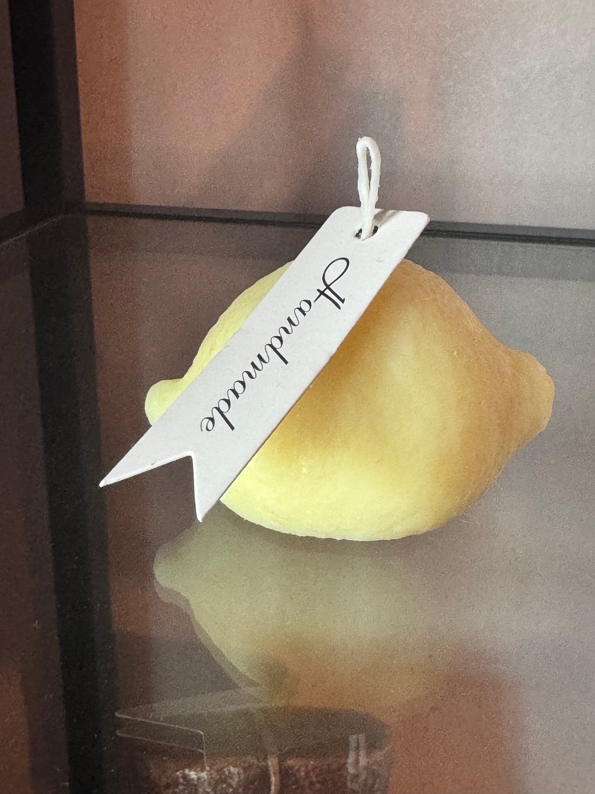 Säg hej till Lemon fusion, vårt handgjutna ljus som ser ut (och doftar!) som en solmogen citron. Med sin friska citrusdoft och lekfulla form blir det både en humörhöjare och en stilren detalj i hemmet. Finns i sojavax för ett mjukare uttryck, och stearin för ett mer klassiskt, krispigt ljus.
