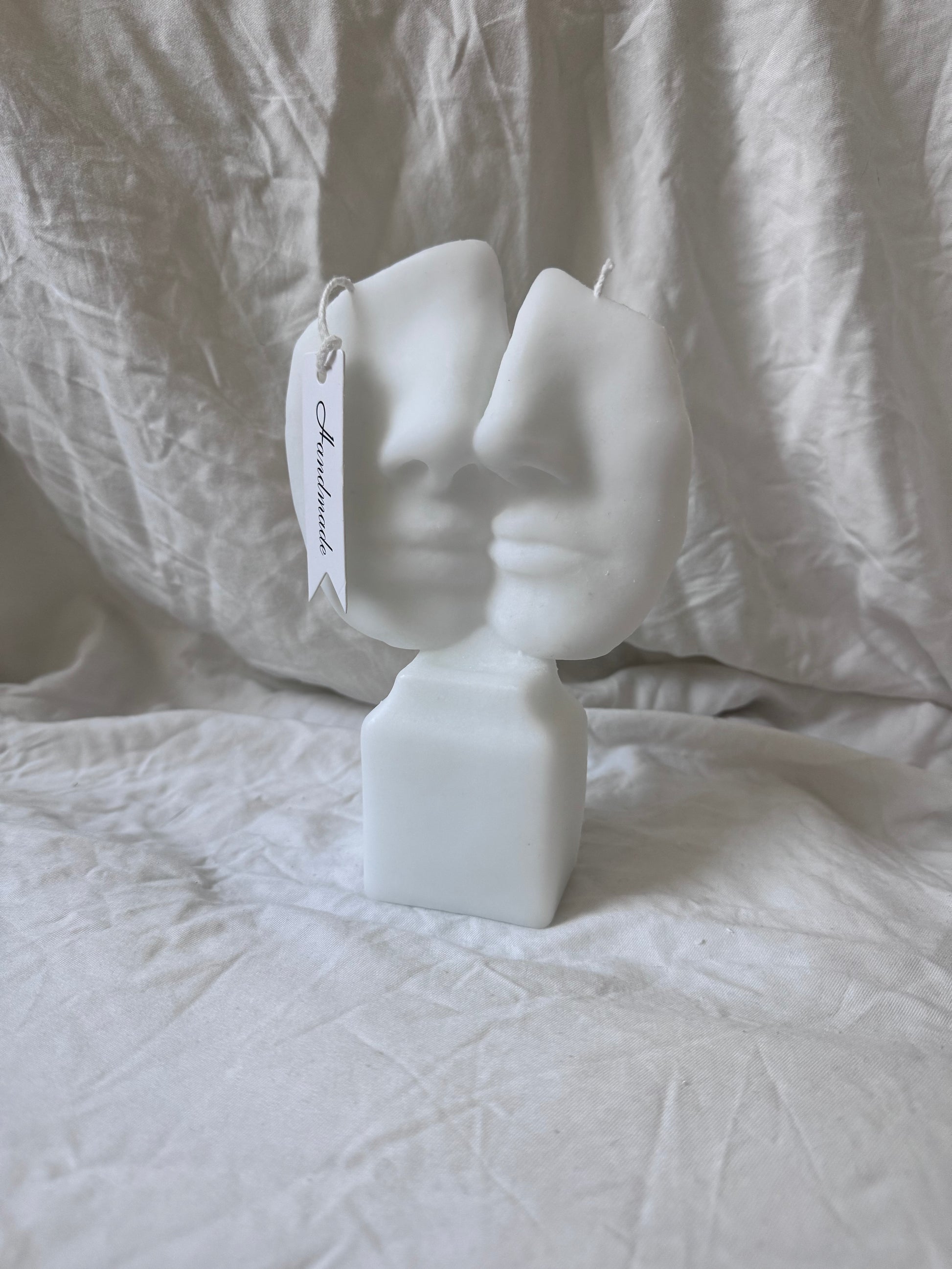 Ett handgjutet ljus där två ansikten möts, sida vid sida, i en stilla och harmonisk form. Den skulpturala designen och den mjuka vita ytan gör det till en elegant detalj i alla rum. Ljuset är främst tänkt som en dekorativ pjäs men om du vill kan du tända det och låta lågan sprida ett varmt sken som förstärker känslan av samhörighet och lugn. Ett ljus som smälter samman konst och känsla.