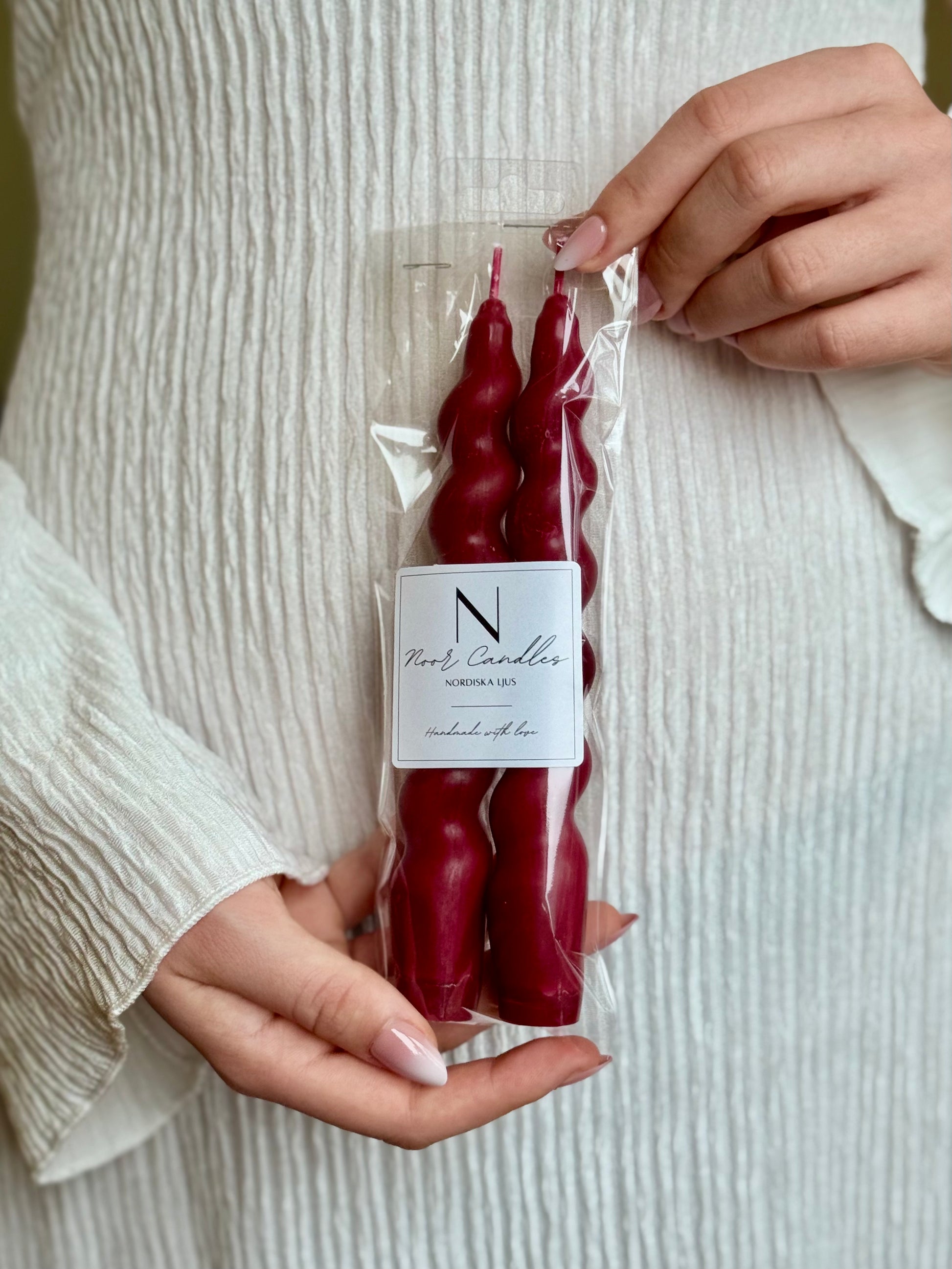 Varje ljus är varsamt tillverkat för hand med noga utvalda material, vilket ger en exklusiv känsla och hög kvalitet. Dom rena vita tonerna gör att de enkelt smälter in i alla inredningsstilar och blir den perfekta detaljen för både vardag och fest.