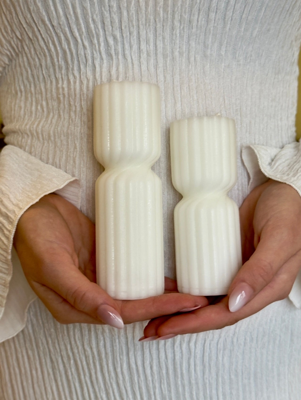 Dessa handgjutna ljus kombinerar stilren design med en lugn och harmonisk känsla. Med sin räfflade yta och pelarform ger de ett elegant intryck, både tända och som en dekorativ detalj i hemmet. 🕯️